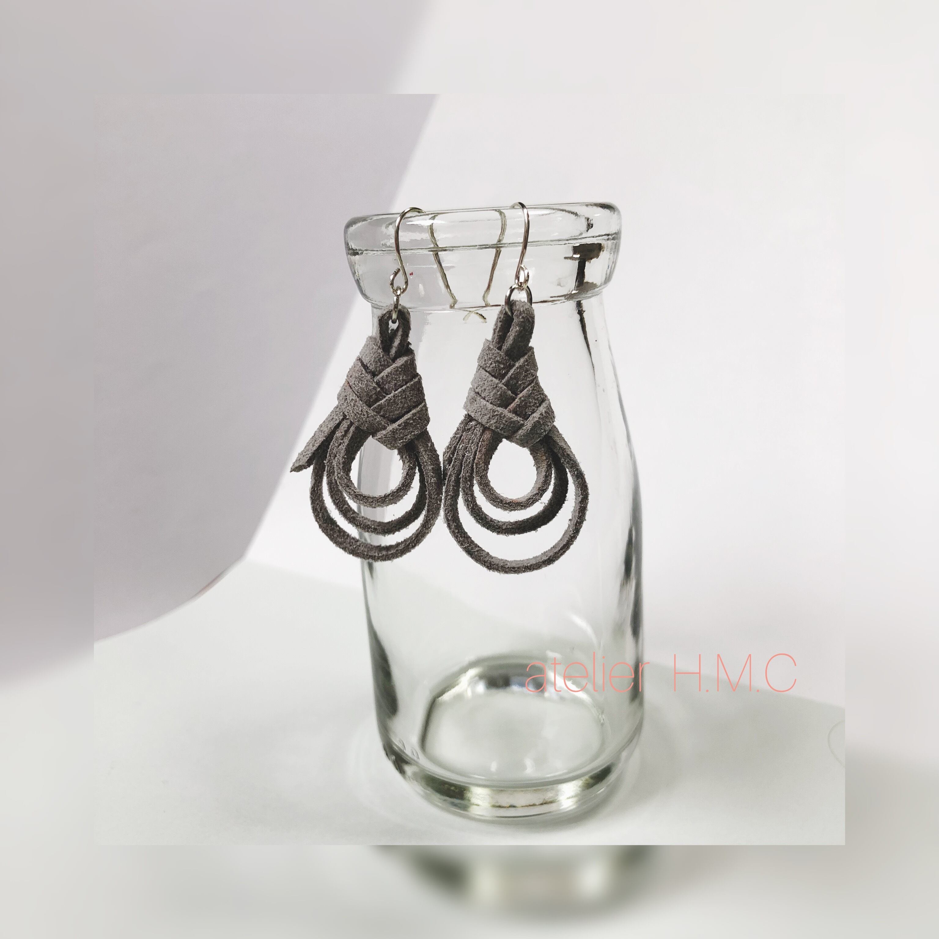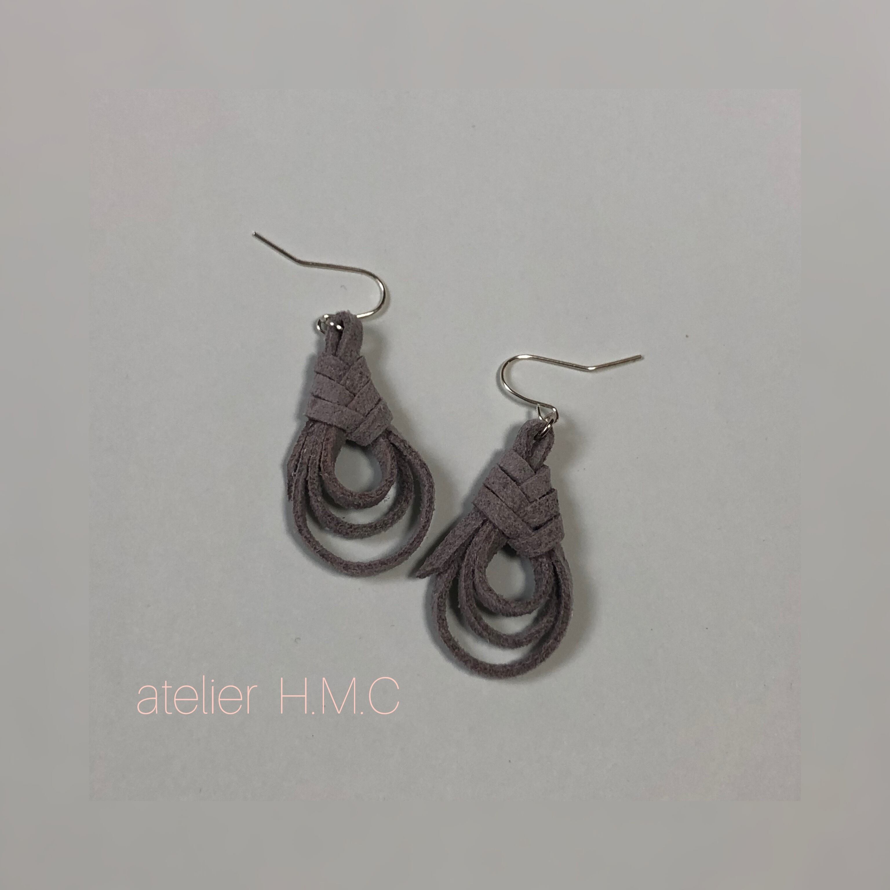 グレーの合皮を編み込んだ、とっても軽いフックピアスです。