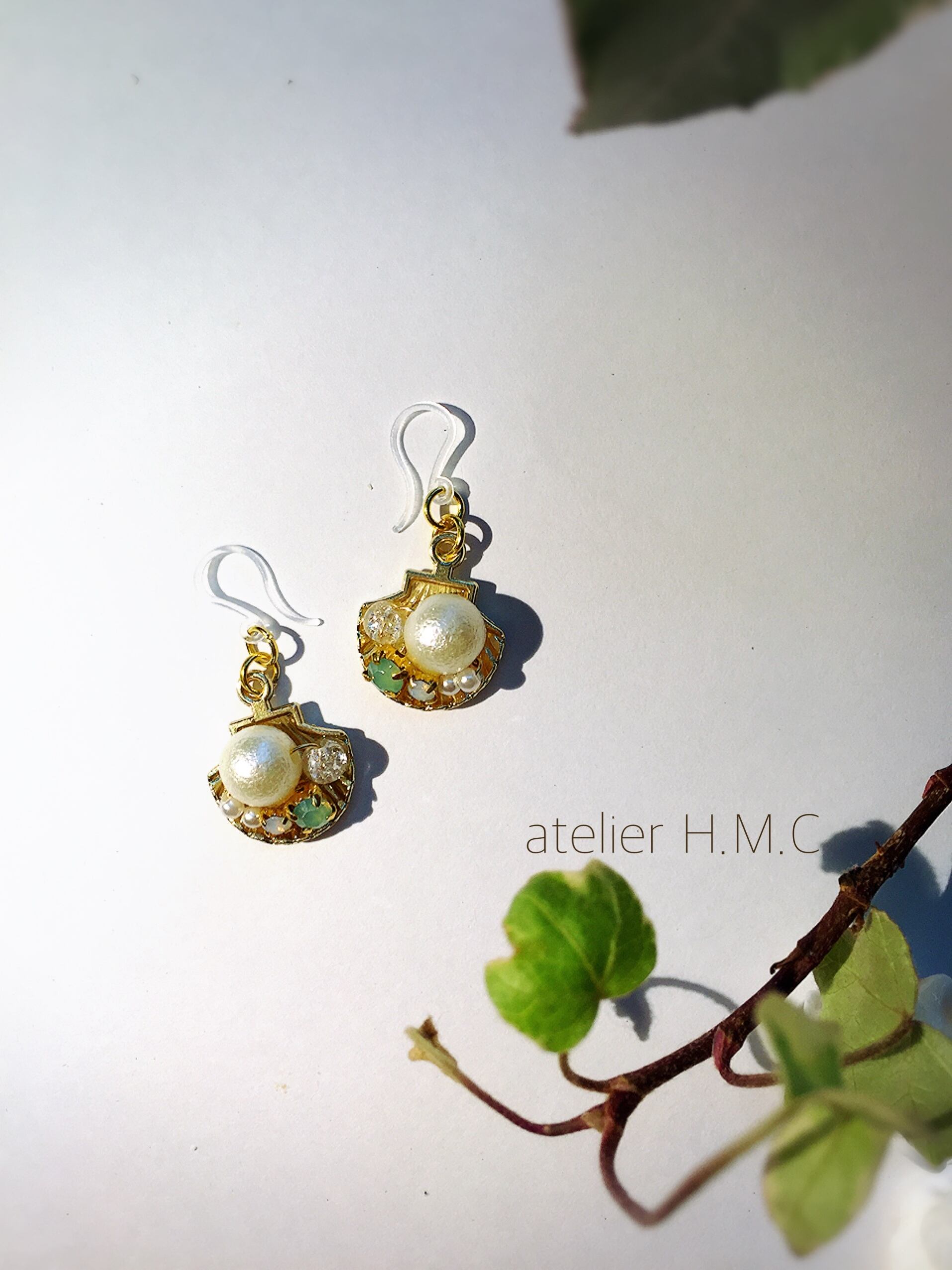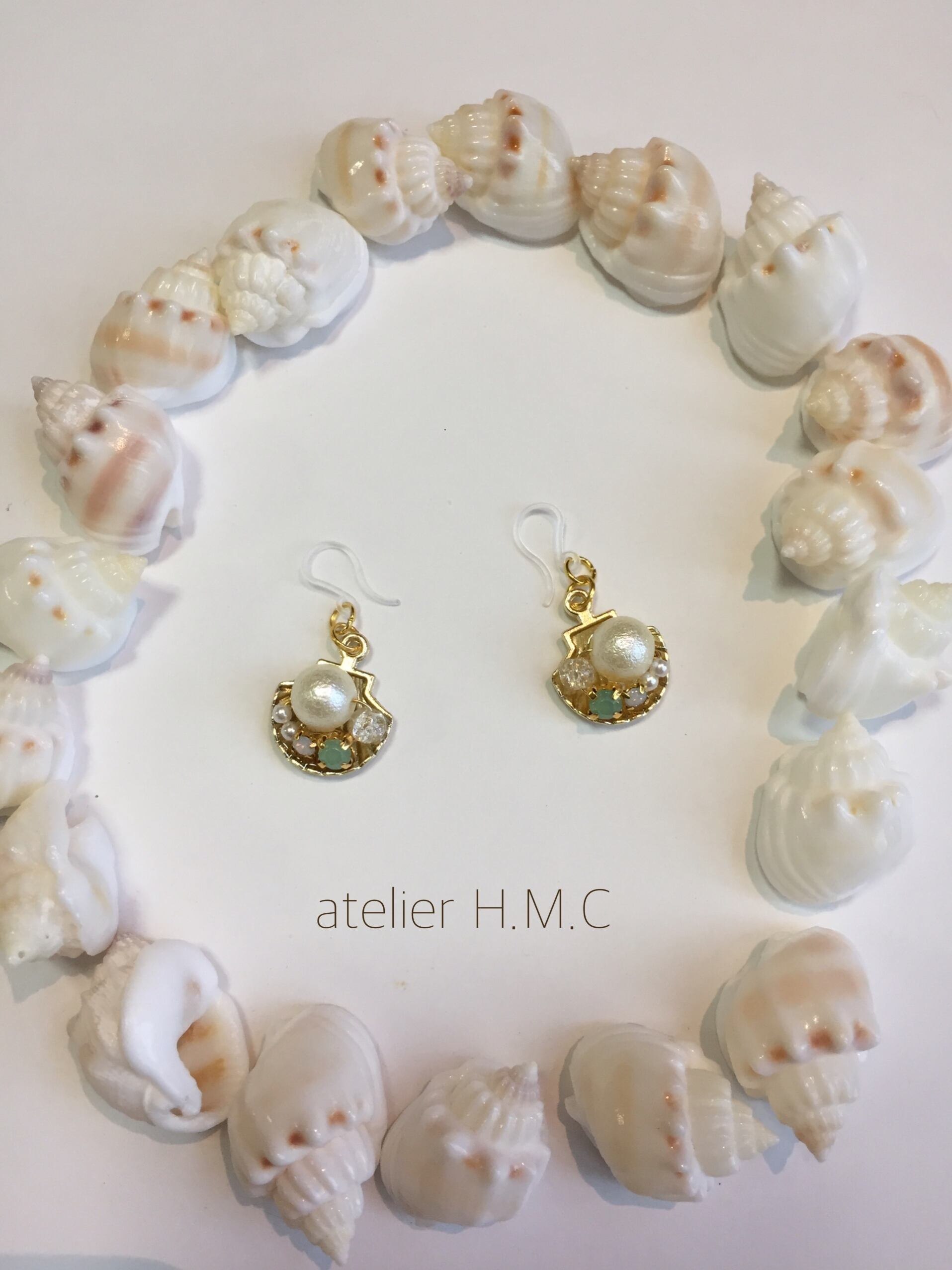 シェルの中にオパールビジューとエメラルドグリーンのビジュー